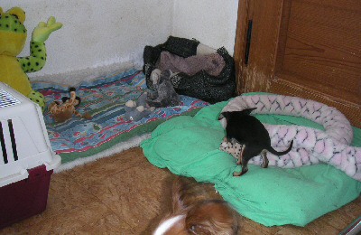 Caramba hatte ihre Welpen im Wohnzimmer zur Welt gebracht, somit vermittelte sie klar, dass sie mit den Kleinen nicht im Hundezimmer "leben" will. Also wurde ihr im Wohnzimmer ein kleiner Teil abgetrennt, damit sie mit ihren Babies nicht vom restlichen Familienleben abgetrennt war (das "Hundezimmer" befindet sich an Küche und Wohnzimmer angrenzend). Die Türe zum Hundezimmer war immer offen, die kleine Familie konnte sich in diesem Bereich also frei bewegen.
